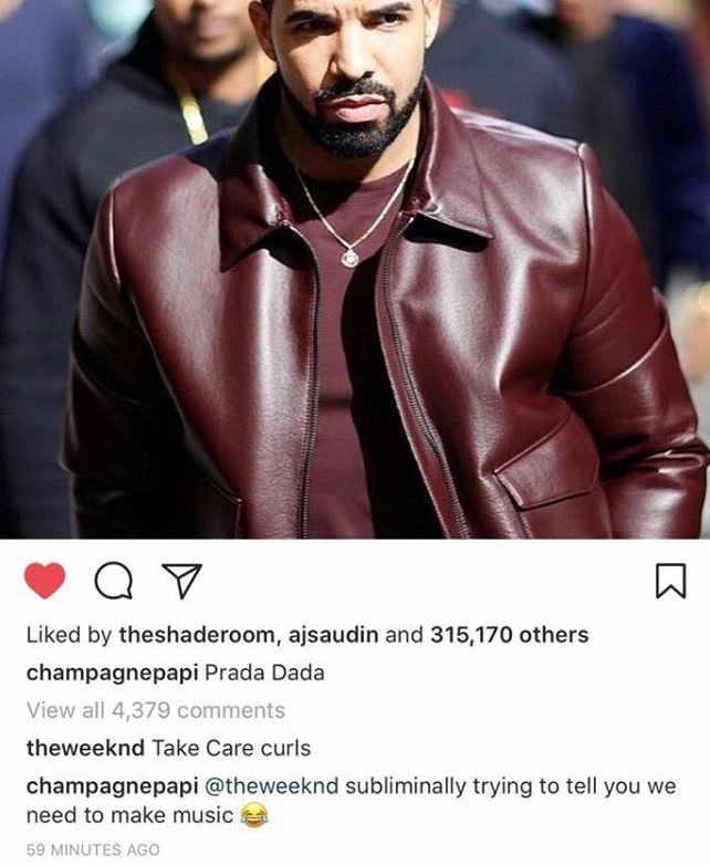 Em nova foto publicada por Drake no Instagram, The Weeknd lembrou do penteado dele, usado na era do álbum Take Care, e com bom humor, o rapper replicou: “tentando te dizer subliminarmente que precisamos fazer música”.