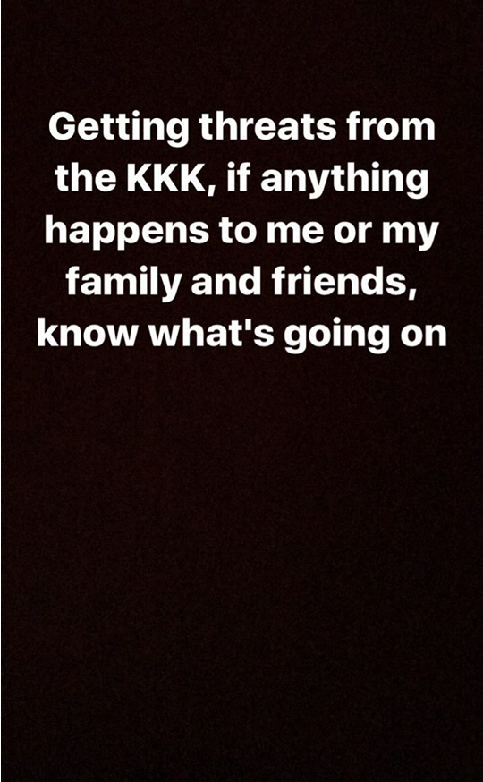 A revelação foi feita hoje (14) por ele no Instagram Stories, onde em algumas mensagens, disse: “recebendo ameaças da KKK, se qualquer coisa acontecer comigo, minha família, ou amigos, sabemos o que se passa. Um vídeo com ameaças da KKK foi ao ar nessa manhã. Eu quero viver uma vida longa o suficiente para olhar para trás pelas coisas que fiz, e dizer que eu influenciei a juventude ou o mundo positivamente de alguma maneira”.