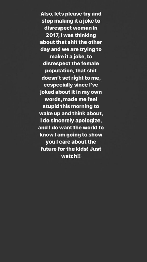 “Mais uma coisa, eu quero me desculpar com toda mulher que desrespeitei ou fiz se sentir violada, dizendo que sou ‘insensível’, eu não quero voltar atrás de tudo que declarei de forma geral, mas eu quero dizer que eu nunca intencionalmente tentei fazer uma mulher se sentir desconfortável ou em perigo por minha causa, então quero mostrar progresso na minha vida, e remorso pelos comentários para as pessoas que me apoiam, e então doarei 100 mil dólares para ajudar programas de prevenção à violência doméstica. Além disso, vamos por favor tentar parar de fazer piadas sobre desrespeitar mulheres em 2017. Eu estava pensando sobre isso outro dia, nós estamos tentando fazer piadas desrespeitando a população fêmea, e essa mer## não parece certa para mim. Especialmente desde que eu brinquei sobre isso com minhas próprias palavras, isso me fez sentir estúpido nessa manhã quando acordei e pensei a respeito. Eu sinceramente peço perdão, e eu quero que o mundo saiba que eu vou mostrar que me importo com o futuro para as crianças! Apenas veja!!