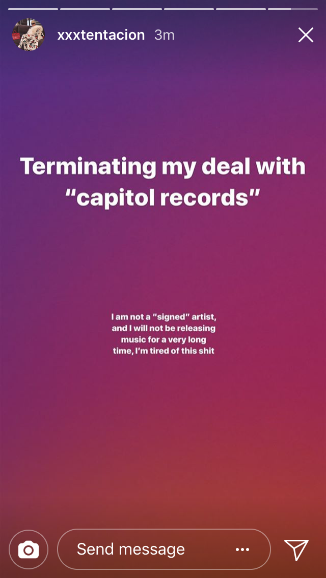 Na última semana, fomos reportados que XXXTentacion tinha assinado contrato de 6 milhões de dólares com a Capitol Records, e parece que ele já não faz mais parte da gravadora. Em publicação hoje (25) no Instagram Stories, o músico anunciou fim de acordo com rótulo, afirmando que não lançará materiais oficialmente por um bom tempo.