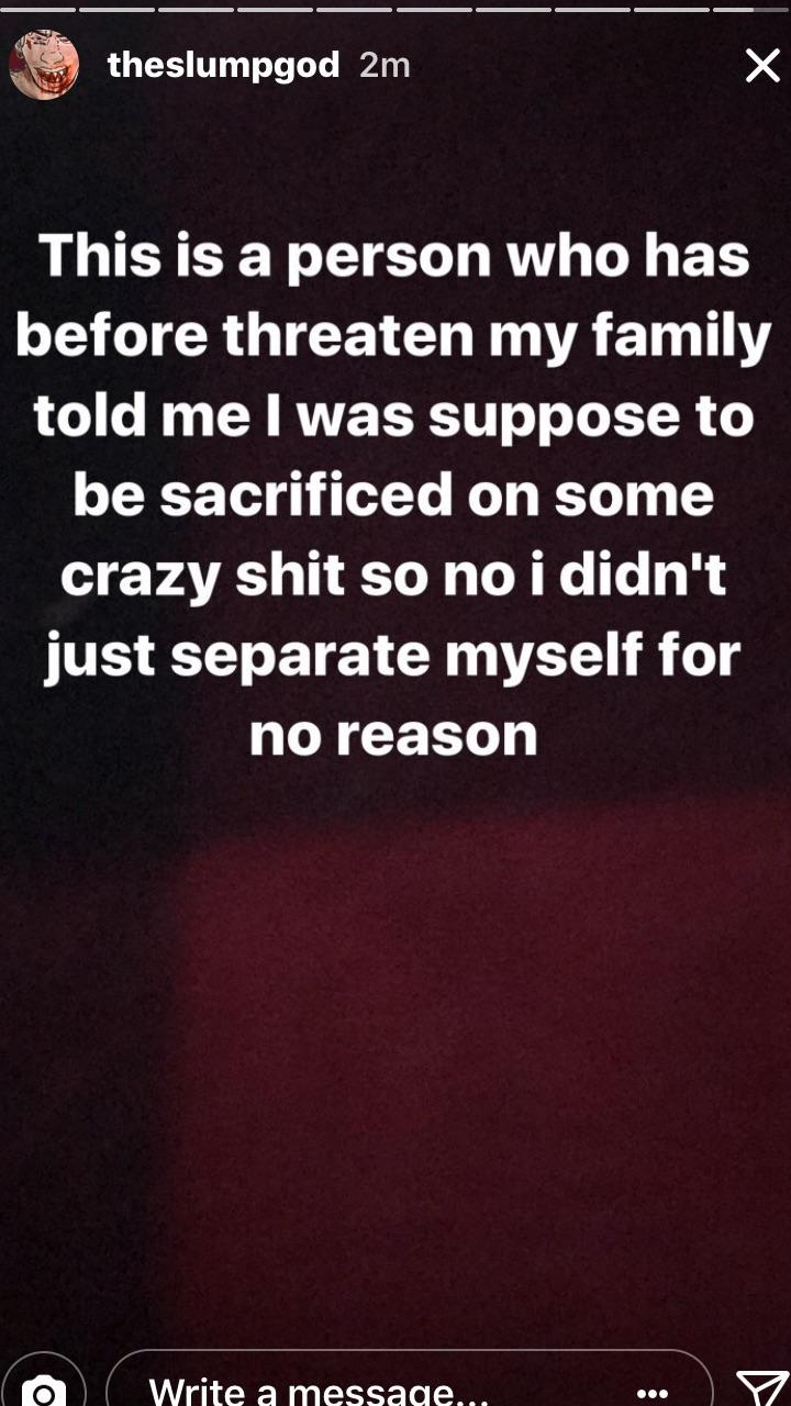 Após então ameaçar remover todo material do seu Soundcloud, X disse que deixaria essa ideia de abandonar carreira de lado caso fãs pedissem para Ski Mask The Slump God, que esteve do lado dele por anos, voltar a ser seu amigo. Recebendo chuva de mensagens, o autor de “BabyWipe” divulgou vídeo declarando: “eu sempre amei esse nego com aparência de alien chamado XXX, mas eu tive que me afastar porque parecia que ninguém conseguiria me ver como um rapper individual se não fizesse isso. Além disso, esse nego é louco para caral##”, seguido de gargalhadas.