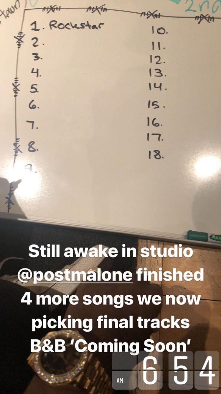 Em imagem publicada ontem (27) em seu Instagram Stories, Dre mostrou que a tracklist do disco deve ser composta por 18 canções, escrevendo: “ainda no acordado no estúdio. Post Malone finalizou mais 4 sons. Agora a gente está selecionando as faixas finais. B&B chega em breve”.