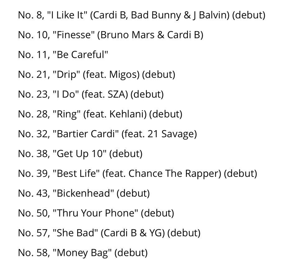 Em nova atualização do Hot 100, a rapper conseguiu incluir 13 faixas simultâneas no chart, superando Beyoncé como a artista feminina com mais canções ao mesmo tempo na parada, que detinha recorde anterior com um total de 12. A melhor colocada entre essas é a “I Like It” em colaboração com Bad Bunny e J Balvin, música que estreou de cara em #8, e já teve videoclipe gravado.