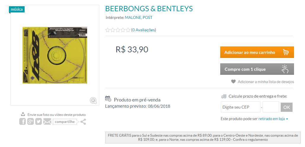Com lançamento oficial previsto para o dia 8 de junho, hoje (25) o álbum Beerbongs & Bentleys teve pré-venda liberada nos sites da Livraria Cultura e Saraiva, onde está sendo repassado pelo valor de R$ 33,90. Tudo indica que o disco também deva chegar às lojas físicas das empresas, então se você é um grande fã do Post, tem aqui uma ótima oportunidade para adquirir corpo de trabalho e apoiar o artista, o qual eventualmente pode até pensar em shows no Brasil.