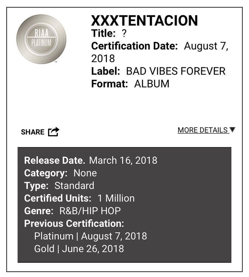 Como consequência da sua morte, X teve venda de materiais oficiais lançados enquanto vivo decolando, e o “?” também foi atingido por esse reflexo. Hoje (14), fomos notificados que o álbum, lançado no meio de março, trazendo colaborações do Joey Badass, Rio Santana, PnB Rock, entre outros, conquistou certificado de platina, que simboliza a vendagem de 1 milhão de unidades em solo americano.